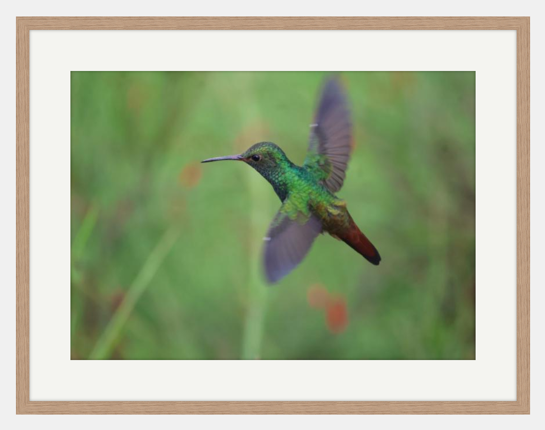 A colourful photo of a hummingbird in flight on the way to collect nectar, taken on our trip to Costa Rica. This CoolArt2021 picture will be printed as a ‘Giclee’ standard print on a heavy weight matte paper. TFPC uses high grade Perspex brand acrylic as glazing. It is 2.5mm thick and indistinguishable from normal glass, except that it’s optically clearer and less fragile. The framed prints are strung with picture cord for hanging, as standard. The framed prints are delivered by courier in the UK, at only £8.95.