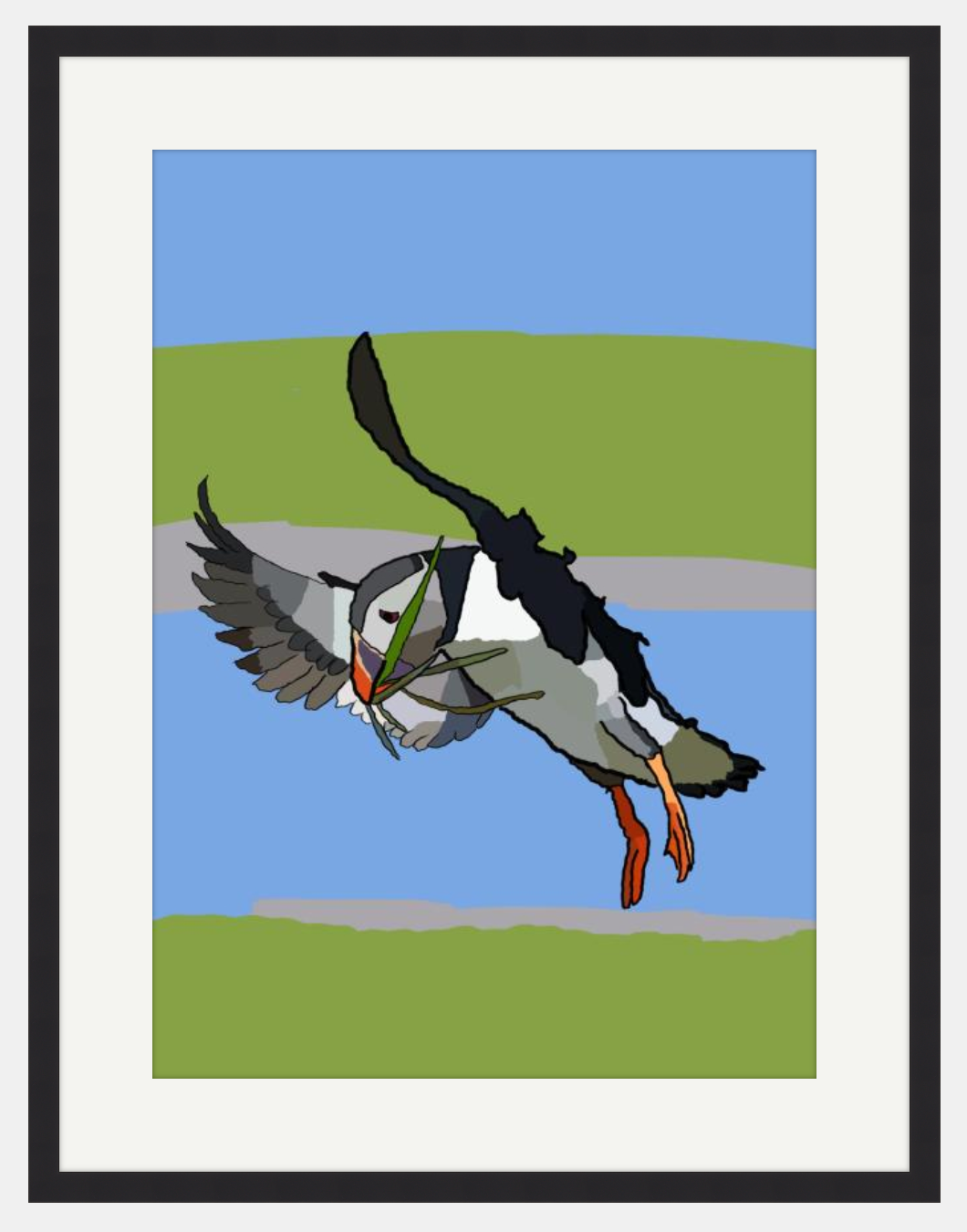 A puffin landing on the isle of Lunga, off Mull, Scotland, based on my brother’s photo. This picture will be exhibited as part of the Autism and Art charity sale at the Firepit Gallery, London, in May 2025. This CoolArt2021 picture will be printed as a ‘Giclee’ standard print on a heavy weight matte paper. TFPC uses high grade Perspex brand acrylic as glazing. It is 2.5mm thick and indistinguishable from normal glass, except that it’s optically clearer and less fragile. The framed prints are strung with picture cord for hanging, as standard. The framed prints are delivered by courier in the UK, at only £8.95.
